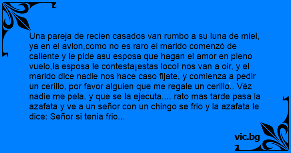 Una pareja de recien casados van rumbo a su luna de miel, ya en el avion,como no es raro el marido comenzó de caliente y le pide asu esposa que hagan el amor en pleno vuelo,la esposa le contesta¡estas lосо! nos van a oir, y el marido dice nadie nos hace caso fijate, y comienza a pedir un cerillo, por favor alguien que me regale un cerillo.. Véz nadie me pela. y que se la ejecuta.... rato mas tarde pasa la azafata y ve a un señor соn un chingo se frio y la azafata le dice: Señor si tenia frio por q no me pidio una cobija, y le dice hay señorita el de atras pidio un cerillo y... se lo estaban cojiendo!!!!...