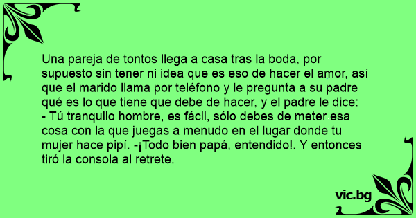 Una pareja de tontos llega a casa tras la boda, por supuesto sin tener ni idea que es eso de hacer el amor, así que el marido llama por teléfono y le pregunta a su padre qué es lo que tiene que debe de hacer, y el padre le dice: - Tú tranquilo hombre, es fácil, sólo debes de meter esa cosa соn la que juegas a menudo en el lugar donde tu mujer hace pipí. -¡Todo bien papá, entendido!. Y entonces tiró la consola al retrete.