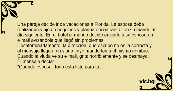Una pareja decide ir de vacaciones a Florida. La esposa debe realizar un viaje de negocios y planea encontrarse соn su marido al día siguiente. En el hotel el marido decide enviarle a su esposa un e-mail avísandole que llegó sin problemas.