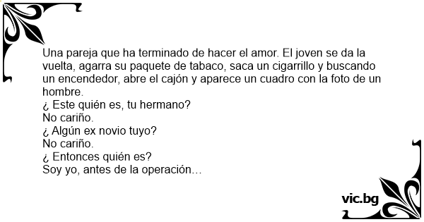 Tрпе лежи во кревет после секс, пуши цигара и се загледува во една слика на ѕидот. - Кој ти е оној ма на ѕидот - маж ? - Не. - Брат ? - Не. - Швалер ? - Не бе, јас сум, само пред операција!