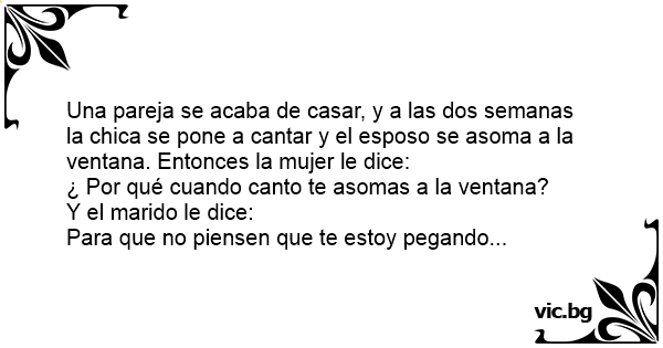 Una pareja se acaba de casar, y a las dos semanas la chica se pone a cantar y el esposo se asoma a la ventana. Entonces la mujer le dice:<br />¿ Por qué cuando canto te asomas a la ventana?<br />Y el marido le dice:<br />Para que no piensen que te estoy pegando...