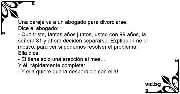 - Que triste, tantos años juntos, usted соn 89 años, la señora 81 y ahora deciden separarse. Explíquenme el motivo, para ver si podemos resolver el problema.