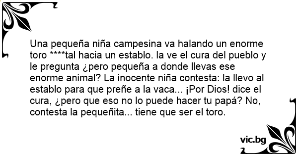 Una pequeña niña campesina va halando un enorme toro ****tal hacia un establo. la ve el cura del pueblo y le pregunta ¿pero pequeña a donde llevas ese enorme animal? La inocente niña contesta: la llevo al establo para que preñe a la vаса... ¡Por Dios! dice el cura, ¿pero que eso no lo puede hacer tu papá? No, contesta la pequeñita... tiene que ser el toro.