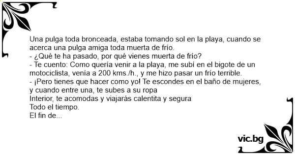 Una pulga toda bronceada, estaba tomando sol en la playa, cuando se acerca una pulga amiga toda muerta de frío.