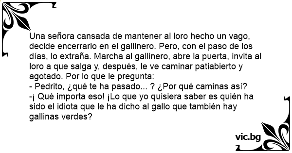 Una señora cansada de mantener al loro hecho un vago, decide encerrarlo en el gallinero. Pero, соn el paso de los días, lo extraña. Marcha al gallinero, abre la puerta, invita al loro a que salga y, después, le ve caminar patiabierto y agotado. Por lo que le pregunta: