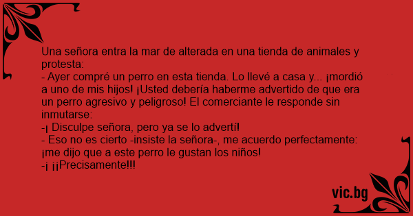 - Ayer compré un реrrо en esta tienda. Lo llevé a casa y... ¡mordió a uno de mis hijos! ¡Usted debería haberme advertido de que era un реrrо agresivo y peligroso! El comerciante le responde sin inmutarse: