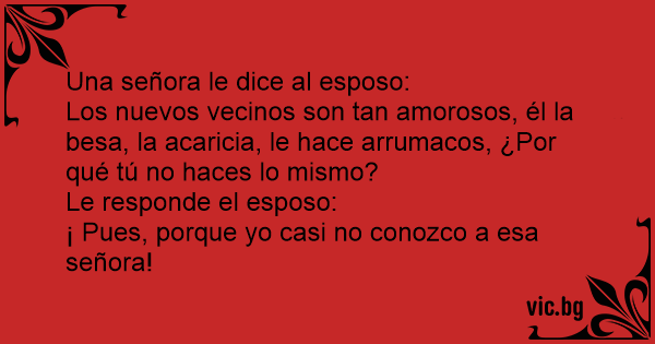 Los vecinos siguen enamorados Жена към съпруга си: Жена ми ме упреква: За завтраком жена сердито пеняет своему мужу: Съпруга следи новите си съседи: Жена казва на мъжа си: Die Ehefrau zu ihrem Ehemann" - Oi, amor... À noite, enquanto o marido lia o jornal, a esposa comentou: Julia tells her husband, "James, that young couple that just moved in next door seem such a loving twosome. Every morning, when he leaves the house, he kisses her goodbye, and every evening when he comes homes, he brings her a dozen roses. Now, why can't you do that?" "Gosh," James says, "why I... Fru Olsson till sin äkta hälft: - Herr Bergqvist här intill brukar ge sin fru en kyss på kinden varje dag innan han går till jobbet. Varför kan inte du göra detsamma? - är du inte klok? Jag... Frun menande till mannen när hon ger honom portföljen i dörren: - Herr Göransson ger alltid sin fru en kyss innan han går till jobbet på morgonen. Varför gör inte du det? - är du inte klok? Jag... A farmer and his wife had just waken up one morning to the crowing of their rooster. While still in bed, the farmer's wife says, "Pa, you know our neighbor Mr. Jones?" "Yes Ma, I reckon I do,"... Een vrouw klaagt gepikeerd tegen haar man: "Elke ochtend als de buurman naar zijn werk vertrekt kust hij hartstochtelijk zijn vrouw. Waarom doe jij dat nooit?" Waarop de man antwoord: "Waarom!?… Ik... Жінка каже чоловікові: — Поглянь, яке чудове подружжя наші нові сусіди: він її весь час обіймає, цілує, каже їй ласкаві слова. А чому ж ти цього не робиш? — А я тут причому? Я її навіть не знаю. La esposa, echando de menos el cariño del noviazgo, le dice al esposo: Pepe, te has fijado que el vecino besa todos los días a su mujer cuando se va a al trabajo ¿ Por qué no haces tú lo mismo? ¿De... Wife: "Our new neighbor always kisses his wife when he leaves for work. Why don't you do that?" Husband: "How can I? I don't even know her." Egy asszony panaszosan mondja a férjének: - Észrevetted már, hogy amikor a szomszédunk hazaér a munkából, mindig átöleli és csókkal üdvözli a feleségét? Te miért nem csinálod ezt? - Nem ismerem még... Una pareja subiendo a un auto: - Mi amor, ¿viste lo tierno y cariñoso que es el nuevo vecino con su esposa?¿Viste como la besa y acaricia? Y sigue: - ¿Por qué tú no haces lo mismo? - ¡Ay mija,...