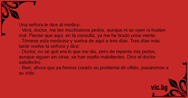 - Verá, doctor, me tiro muchísimos pedos, aunque ni se oyen ni huelen mal. Piense que aquí, en la consulta, ya me he tirado unos veinte.