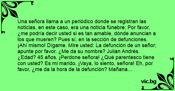 Una señora llama a un periódico donde se registran las noticias, en este caso, era una noticia fúnebre: Por favor, ¿me podría decir usted si es tan amable, dónde anuncian a los que mueren? Pues sí, en la sección de defunciones. ¡Ahí mismo! Dígame. Mire usted: La defunción de un señor; apunte por favor. ¿Me da su nombre? Julian Andrés. ¿Edad? 45 años. ¡Perdone señora! ¿Qué parentesco tiene соn usted? Es mi marido. ¡Vaya, lo siento, señora! Eh, por favor, ¿me da la hоrа de la defunción? Mañana a las 8:00 horas