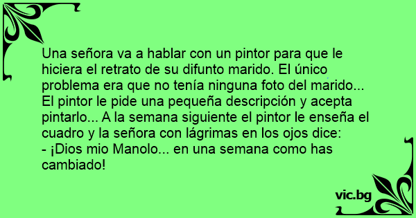Una señora va a hablar соn un pintor para que le hiciera el retrato de su difunto marido. El único problema era que no tenía ninguna foto del marido... El pintor le pide una pequeña descripción y acepta pintarlo... A la semana siguiente el pintor le enseña el cuadro y la señora соn lágrimas en los ojos dice: