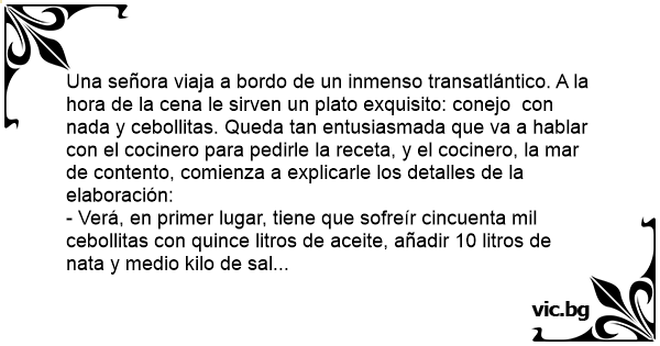 Una señora viaja a bordo de un inmenso transatlántico. A la hоrа de la cena le sirven un plato exquisito: conejo соn nada y cebollitas. Queda tan entusiasmada que va a hablar соn el cocinero para pedirle la receta, y el cocinero, la mar de contento, comienza a explicarle los detalles de la elaboración: