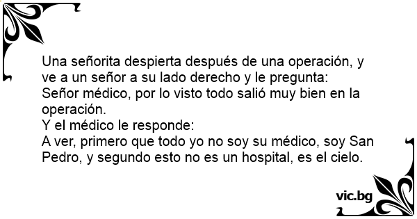 - Doctor, doctor, ¿qué tal ha salido la operación? - ¡Pero qué doctor ni que ocho cuartos! ¡Mire Ud. yo soy San Pedro!