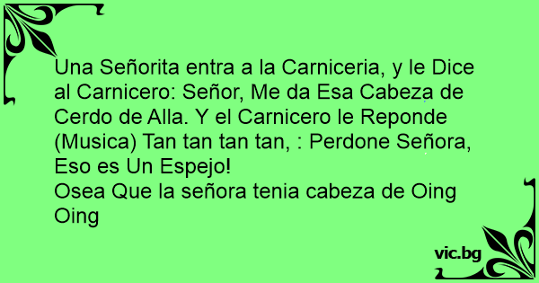 Una Señorita entra a la Carniceria, y le Dice al Carnicero: Señor, Me da Esa Cabeza de Cerdo de Alla. Y el Carnicero le Reponde (Musica) Tan tan tan tan, : Perdone Señora, Eso es Un Espejo!