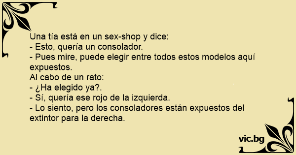 Една блондинка влиза в секс-магазин и почва да разглежда вибраторите. Баба влиза в секс магазин и пита продавачката: Разкошна жена на около 45 години влиза в секс шоп-а и търси вибратор Una bella signora sui quarantacinque anni entra in un negozietto per grandi, si avvicina al commesso e gli chiede un vibratore. Susanne steht im Sex-Shop und will unter den angebotenen Vibratoren wählen. A man is working a a d*ldo store, when a brunette walks in. Une femme rentre dans un sex-shop et se rend au rayon godes-michets. Elle les regarde tous : des longs, des pointus, des bossus, etc. Un vendeur arrive pour lui demander son choix. Elle lui répond : - Señorita ¿Tiene consoladores? - Si, en aquella estantería, elija el que quiere - Me llevo este rojo - Señora, el extintor no se vende Certa vez, uma bicha foi a uma loja comprar um pênis de plástico.Chegou lá e o atendente da loja, logo perguntou: — O que a senhora deseja? A bicha com vergonha diz: — Ai, tô com vergonha! O atendente então insiste: — Senhora, o que você deseja? A bicha toda envergonhada responde: — Um pênis de... Uma bichinha chega num sexshop e fala pro atendente: — Bofe, tem pênis de borracha? — Tem sim. — Respondeu o atendente, abrindo uma cortina e mostrando vibradores de todas as cores e tamanhos. Depois de muita dúvida a bichinha dis: — Vou levar aquele grandão e vermelho dalí! O atendente responde:... Uma bicha entrou num sexy-shop. Toda discreta, chama um vendedor e pergunta pelos pintos de borracha. O vendedor leva numa sala reservada e mostra vários pintos de tamanho e cores diversas. A bicha... Una donna entra in un sex-shop per comprare un fallo finto. Si guarda in giro un po’ imbarazzata, ne vede uno rosso che gli piace, poi dice al commesso: - 'allora, vorrei quello verde lì, quello... Una signora in un sexy shop: “Vorrei un fallo di gomma”. Il gestore: “Ne abbiamo di tutti i tipi, dimensioni e colori. Quale vuole?”. “Voglio quello rosso”. “No, quello non è in vendita”. “E... Une femme se rend dans un sexe-shop pour acheter des gods car son mari et décédé, donc la femme regarde les gods et un vendeur viens pour la renseigné , Le vendeur : puis-je vous aider ? La femme :... I sexshoppen: - Vad kostar den där stora röda dildon? - Tyvärr, den är inte till salu – Va? Varför inte? - Det är vår brandsläckare… - Hvor er dildoerne? - Lige derovre frue. - Jeg snupper den røde tak. - Beklager frue, ildslukkeren er ikke til salg!!! - Jag skulle vilja köpa den där stora röda dildon. - Tyvärr, det där är en brandsläckare. Přijde blondýnka do sexshopu a ptá se: "Kolik stojí ten modrý vibrátor?" "Čtyřista korun." odvětí prodavač. "A za kolik je ten zelený?" "Ten je za sedmset korun." "No a kolik stojí ten červený?"... A velhinha vai na farmácia e pergunta discretamente para o atendente: — O senhor tem vibradores ? O atendente meio assustado com o pedido da velhinha, vira discretamente e mostra os aparelhos... C'est une blonde qui rentre dans un magasin de sextoys, et elle dit au vendeur : Bonjour je voudrais le jaune,le vert et le rouge. Le vendeur lui répond : le vert et le jaune sa sera possible mais... A gay guys walks into a pharmacy with his suppository prescription and approaches the front counter. He hands the prescription to the pharmacist and after confirming the prescription, the... A loira entra na loja e pede um vibrador: — Pois não senhora, temos de todo tipo cor e tamanho, diz o atendente. — Quanto custa aquele maior ali no canto, diz a loira. — Desculpe senhora, mas... Iena blondine i vibratoriu parduotuve ir sako kiek kainuoja tas vibratorius 100 lt ne man reik didesnio o kiek tas kur ant sienos tas neparduodamas o uz kiek man ji parduotumet nu kaip jum tai uz... Ateina blondine i erotine prekiu parduotuve ir klause pardavejos .. sakykit po kiek pas jus vibratoriai.? PARDAVEJE : 100lt 120lt 150lt BLONDINE: sakykit o tas dydelis raudonas po kiek?... Доаѓа плавуша во секс шоп: - Каде ви се вибраторите? - Тука, на овој ѕид. - Ууууу, може овој црвениов? - Госпоѓо, тоа е апаратот за гаснење пожар. Некоја жена сакала да си купи вибратор и отишла во секс шоп. Продавачот и рекол да си одбере од закачените вибратори на ѕидот. Гледала жената гледала, на крај се одлучила: - Еве ке го земам оној... A blonde goes into a sex shop and asks the salesmen where the vibrators are and the sales man points to one of the walls so she walks over to them and she sees a very nice and big red one She asks... Πηγαίνει μία ξανθιά σε sex-shop ξαναμένη, και κοιτάζει στους δ*νητές. Λέει στο υπάλληλο να της δείξει τους καλούς και εκείνος αρχίζει… – Αυτός είναι 13 πόντοι μήκος, 9 περίμετρος και πολύ καλός με...