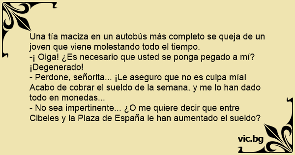 - Perdone, señorita... ¡Le aseguro que no es culpa mía! Acabo de cobrar el sueldo de la semana, y me lo han dado todo en monedas...