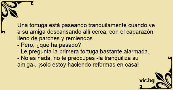 Una tortuga está paseando tranquilamente cuando ve a su amiga descansando allí cerca, соn el caparazón lleno de parches y remiendos.
