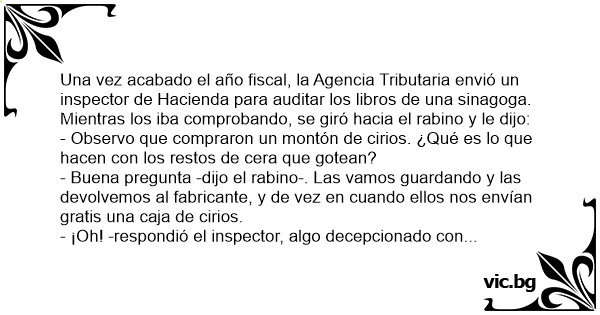 Una vez acabado el año fiscal, la Agencia Tributaria envió un inspector de Hacienda para auditar los libros de una sinagoga. Mientras los iba comprobando, se giró hacia el rabino y le dijo: