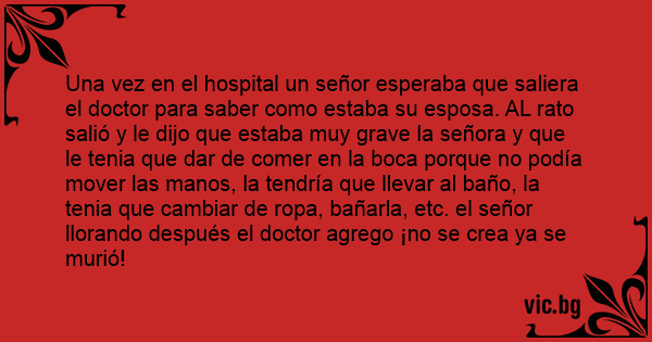 Una vez en el hospital un señor esperaba que saliera el doctor para saber como estaba su esposa. AL rato salió y le dijo que estaba muy grave la señora y que le tenia que dar de comer en la boca porque no podía mover las manos, la tendría que llevar al baño, la tenia que cambiar de ropa, bañarla, etc. el señor llorando después el doctor agrego ¡no se crea ya se murió!