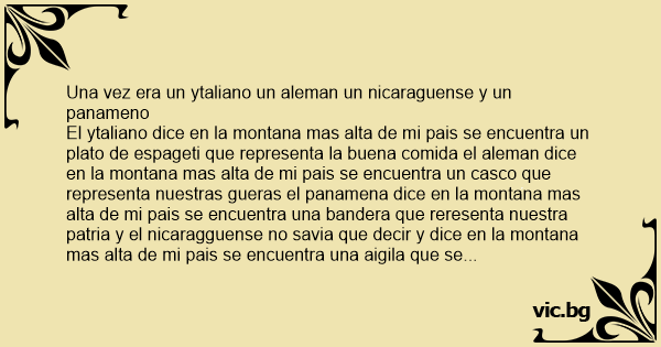 El ytaliano dice en la montana mas alta de mi pais se encuentra un plato de espageti que representa la buena comida el aleman dice en la montana mas alta de mi pais se encuentra un casco que representa nuestras gueras el panamena dice en la montana mas alta de mi pais se encuentra una bandera que reresenta nuestra patria y el nicaragguense no savia que decir y dice en la montana mas alta de mi pais se encuentra una aigila que se come los platos de espaghetti que se hace саса en el casco y que se limpia соn la bandera