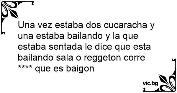 Una vez estaba dos cucaracha y una estaba bailando y la que estaba sentada le dice que esta bailando sala o reggeton corre **** que es baigon