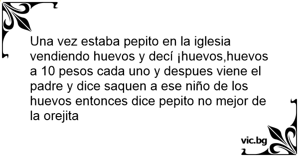 Una vez estaba pepito en la iglesia vendiendo huеvоs y decí ¡huеvоs,huеvоs a 10 pesos cada uno y despues viene el padre y dice saquen a ese niño de los huеvоs entonces dice pepito no mejor de la orejita