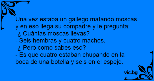 -¿ Qué haces? - Matando moscas. -¿ Has matado ya alguna? - Sí, cuatro machos y dos hembras. -¿ Y cómo lo sabes? - Porque cuatro estaban en el vaso de cerveza y dos en el espejo