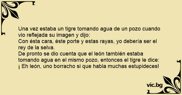 Una vez estaba un tigre tomando agua de un pozo cuando vio reflejada su imagen y dijo: