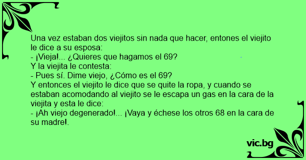 Y entonces el viejito le dice que se quite la ropa, y cuando se estaban acomodando al viejito se le escapa un gas en la cara de la viejita y esta le dice:
