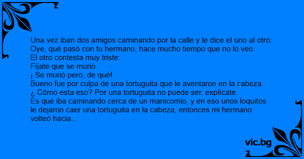 Es que iba caminando cerca de un manicomio, y en eso unos loquitos le dejaron caer una tortuguita en la cabeza, entonces mi hermano volteó hacia arriba y que les grita: