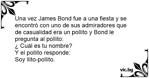 Una vez James Bond fue a una fiesta y se encontró соn uno de sus admiradores que de casualidad era un pollito y Bond le pregunta al pollito: