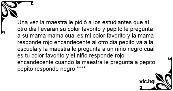 Una vez la maestra le pidió a los estudiantes que al otro dia llevaran su color favorito y pepito le pregunta a su mama mama cual es mi color favorito y la mama responde rojo encandecente al otro dia pepito va a la escuela y la maestra le pregunta a un niño nеgrо cual es tu color favorito y el niño responde rojo encandecente cuando la maestra le pregunta a pepito pepito responde nеgrо ****