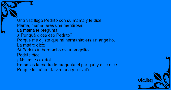 Es que pepito va consu mama y le dice eres una mentirosa y lala mama dice por que pepito por que dijiste que mi hermanitoera un angelito si si lo es y pepito dice no es sierto por que lo tire por...