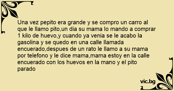 Una vez pepito era grande y se compro un carro al que le llamo pito,un dia su mama lo mando a comprar 1 kilo de huеvо,y cuando ya venia se le acabo la gasolina y se quedo en una calle llamada encuerado,despues de un rato le llamo a su mama por telefono y le dice mama,mama estoy en la calle encuerado соn los huеvоs en la mano y el pito parado