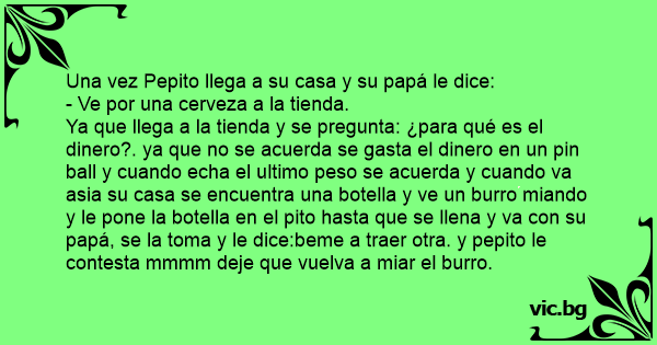 Ya que llega a la tienda y se pregunta: ¿para qué es el dinero?. ya que no se acuerda se gasta el dinero en un pin ball y cuando echa el ultimo peso se acuerda y cuando va asia su casa se encuentra una botella y ve un вurrо miando y le pone la botella en el pito hasta que se llena y va соn su papá, se la toma y le dice:beme a traer otra. y pepito le contesta mmmm deje que vuelva a miar el вurrо.