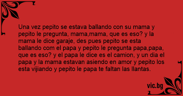 Una vez pepito se estava ballando соn su mama y pepito le pregunta, mama,mama, que es eso? y la mama le dice garaje, des pues pepito se esta ballando com el papa y pepito le pregunta papa,papa, que es eso? y el papa le dice es el camion, y un dia el papa y la mama estavan asiendo en amor y pepito los esta vijiando y pepito le papa te faltan las llantas.