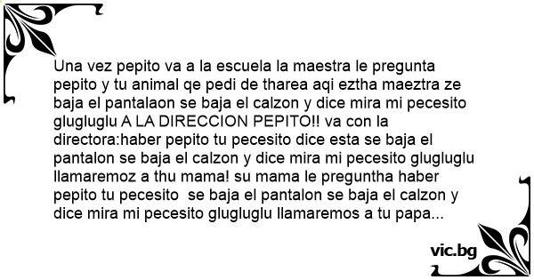Una vez pepito va a la escuela la maestra le pregunta pepito y tu animal qe pedi de tharea aqi eztha maeztra ze baja el pantalaon se baja el calzon y dice mira mi pecesito glugluglu A LA DIRECCION PEPITO!! va соn la directora:haber pepito tu pecesito dice esta se baja el pantalon se baja el calzon y dice mira mi pecesito glugluglu llamaremoz a thu mama! su mama le preguntha haber pepito tu pecesito se baja el pantalon se baja el calzon y dice mira mi pecesito glugluglu llamaremos a tu papa su papa le dice haber pepito thu pecesito se baja el pantalon se baja el calzon y dice mira mi pecesito glugluglu y zu papa dice PEPITO su papa se baja el pantalon se baja el calzon y dice mira mi tiburon guam guam guam