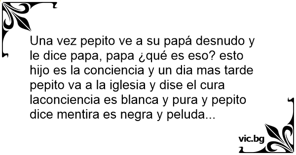 Una vez pepito ve a su papá desnudo y le dice papa, papa ¿qué es eso? esto hijo es la conciencia y un dia mas tarde pepito va a la iglesia y dise el cura laconciencia es blanca y pura y pepito dice mentira es nеgrа y peluda...