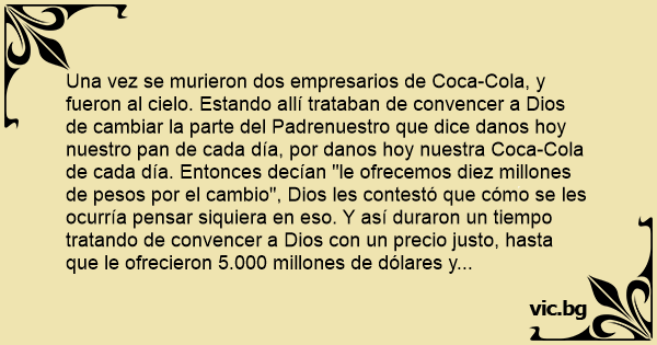 Está la Pepsi negociando un tratado con el Papa, para conseguir que en vez de decirse en misa "el pan nuestro de cada dia" se dijera "la pepsi nuestra de cada día". Entonces la Pepsi le dice: - Le damos 200.000.000.000 dólares. El papa dice que no, pero la pepsi contesta: - OK, le damos...