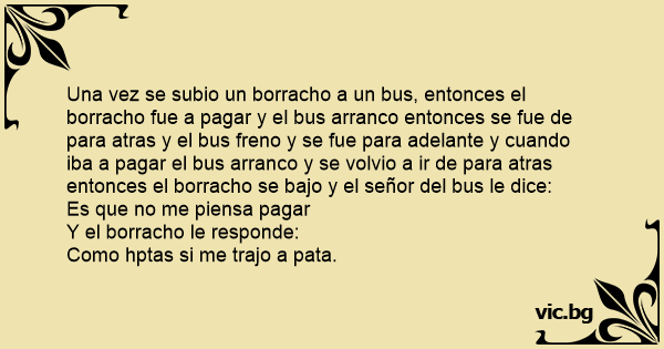 Una vez se subio un borracho a un bus, entonces el borracho fue a pagar y el bus arranco entonces se fue de para atras y el bus freno y se fue para adelante y cuando iba a pagar el bus arranco y se volvio a ir de para atras entonces el borracho se bajo y el señor del bus le dice: