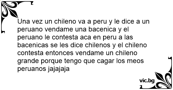 Una vez un chileno va a peru y le dice a un peruano vendame una bacenica y el peruano le contesta aca en peru a las bacenicas se les dice chilenos y el chileno contesta entonces vendame un chileno grande porque tengo que саgаr los meos peruanos jajajaja