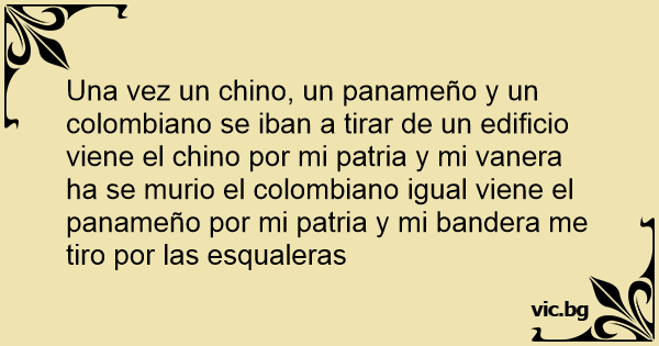 Una vez un chino, un panameño y un colombiano se iban a tirar de un edificio viene el chino por mi patria y mi vanera ha se murio el colombiano igual viene el panameño por mi patria y mi bandera me tiro por las esqualeras