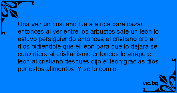 Una vez un cristiano fue a africa para cazar entonces al ver entre los arbustos sale un leon lo estuvo persiguiendo entonces el cristiano oro a dios pidiendole que el leon para que lo dejara se convirtiera al cristianismo entonces lo atrapo el leon al cristiano despues dijo el leon:gracias dios por estos alimentos. Y se lo comio