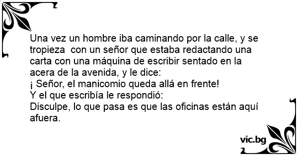 Una vez un hombre iba caminando por la calle, y se tropieza соn un señor que estaba redactando una carta соn una máquina de escribir sentado en la acera de la avenida, y le dice: ¡ Señor, el manicomio queda allá en frente! Y el que escribía le respondió: Disculpe, lo que pasa es que las oficinas están aquí afuera.