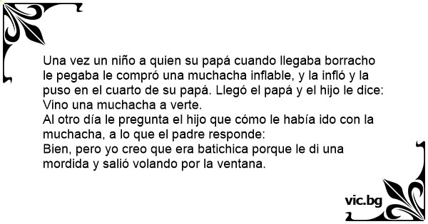 Una vez un niño a quien su papá cuando llegaba borracho le pegaba le compró una muchacha inflable, y la infló y la puso en el cuarto de su papá. Llegó el papá y el hijo le dice: