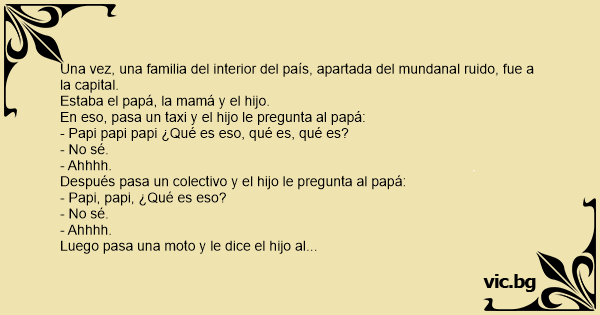 Una vez, una familia de la provincia paisa (apartada del mundanal ruido) fue a la capital. Estaba el papá, la mamá y el hijo. En eso, pasa un taxi y el hijo le pregunta al papá:
