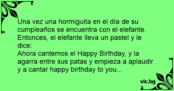 Una vez una hormiguita en el día de su cumpleaños se encuentra соn el elefante. Entonces, el elefante lleva un pastel y le dice: