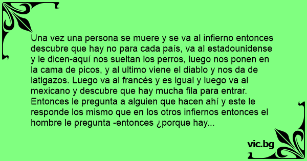 Una vez una persona se muere y se va al infierno entonces descubre que hay no para cada país, va al estadounidense y le dicen-aquí nos sueltan los perros, luego nos ponen en la cama de picos, y al ultimo viene el diablo y nos da de latigazos. Luego va al francés y es igual y luego va al mexicano y descubre que hay mucha fila para entrar. Entonces le pregunta a alguien que hacen ahí y este le responde los mismo que en los otros infiernos entonces el hombre le pregunta -entonces ¿porque hay tanta gente . Alo que el le responde-es que aquí los perros se murieron de roña, la cama de picos esta destruida y ya no tiene picos y el diablo solo viene te da unos latigazos le da flojera y se va.