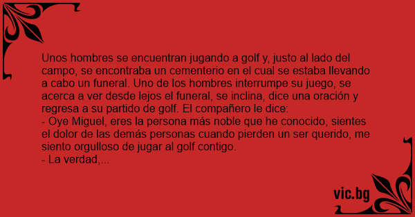Se encontraban dos hombres jugando al golf, en uno de los campos más bonitos de la ciudad. En eso, ven pasar a un funeral al camposanto del lado. Uno de los hombres se detiene, se hinca, se persigna y reza mientras pasa el funeral. El otro hombre, asombrado dice: Hombre, te felicito, eso muestra...