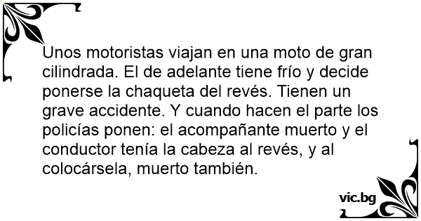 Unos motoristas viajan en una moto de gran cilindrada. El de adelante tiene frío y decide ponerse la chaqueta del revés. Tienen un grave accidente. Y cuando hacen el parte los policías ponen: el acompañante muerto y el conductor tenía la cabeza al revés, y al colocársela, muerto también.