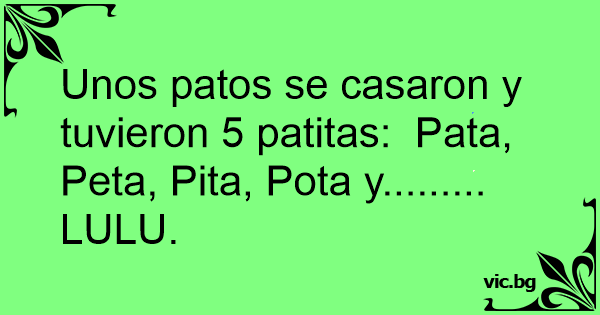 Unos patos se casaron y tuvieron 5 patitas: Pata, Peta, Pita, Pota y......... LULU.